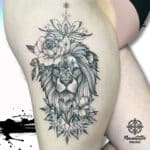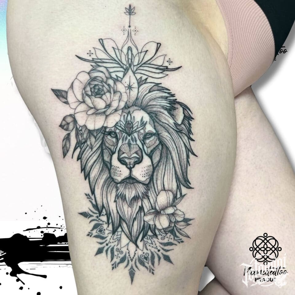 Tetování lev znamení zvěrokruhu a mandala, mandala lotus a květiny, růže na boku stehna