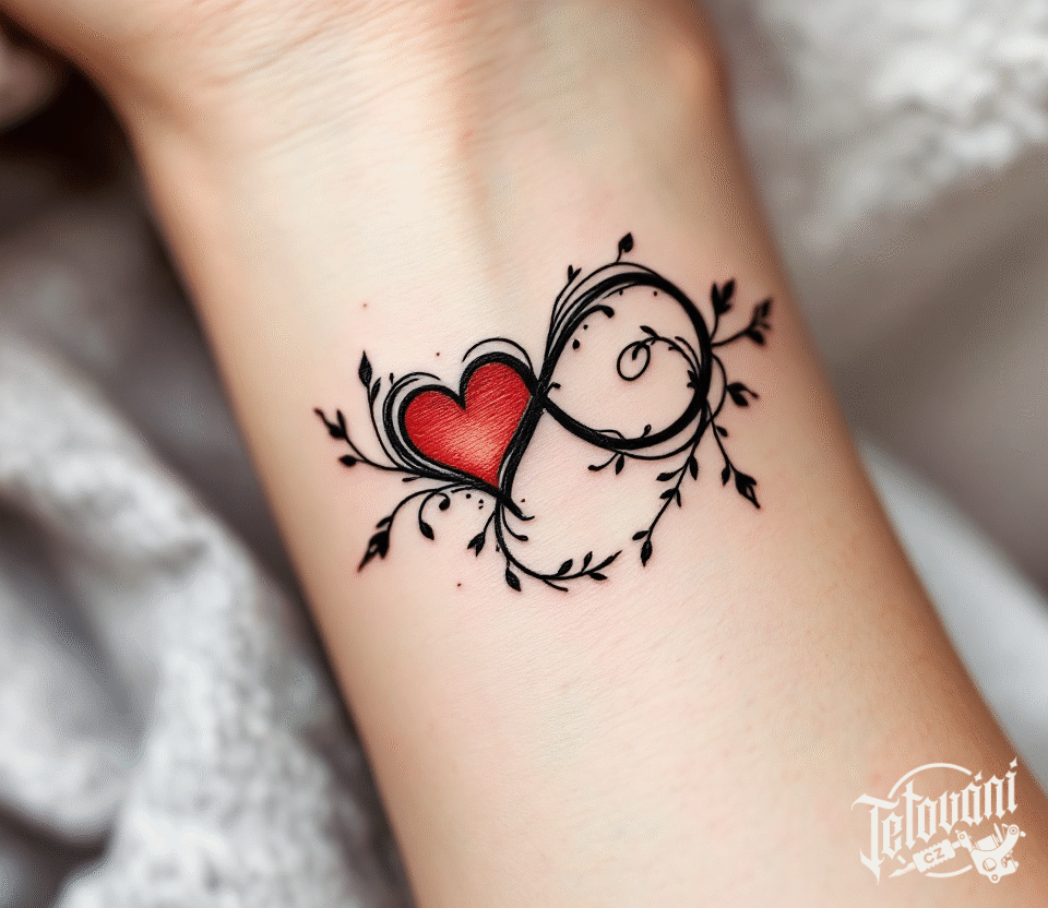 Tetování ležatá osmička, nekonečno srdce s lístky na předloktí