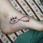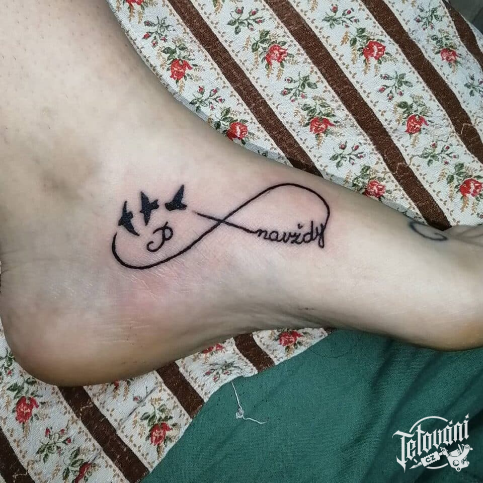 Tetování ležatá osmička s písmenem, nápis na nárt