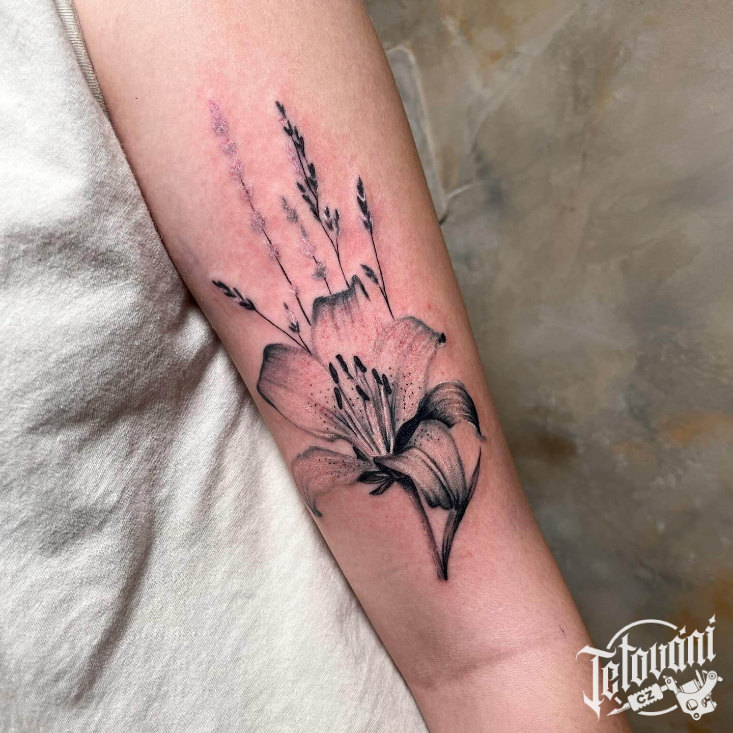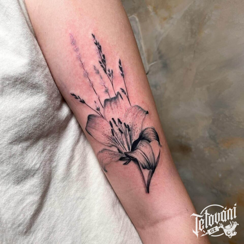 Tetování lilie na předloktí v realistickém stylu