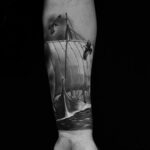 Tetování loď na moři s ptáky, symbol svobody na předloktí