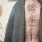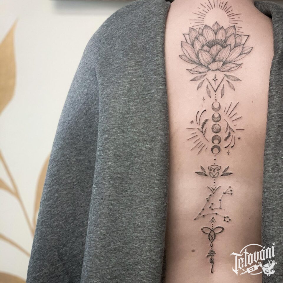 Tetování lotos, květina, ornamenty, fáze měsíce na páteř