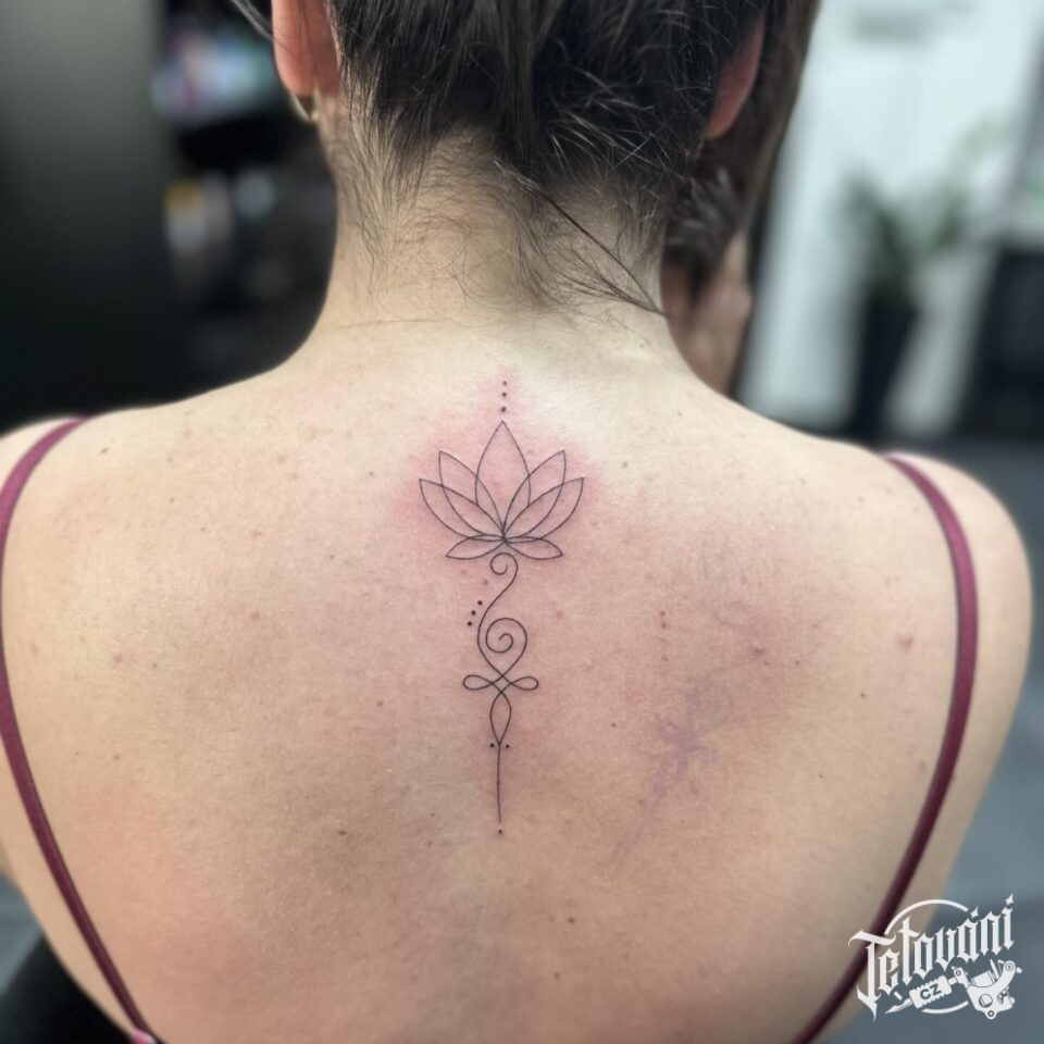 Tetování lotos s ornamenty na páteř