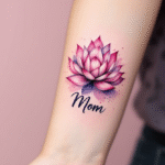 Tetování lotosový květ s nápisem máma jako symbol mateřské lásky na ruku