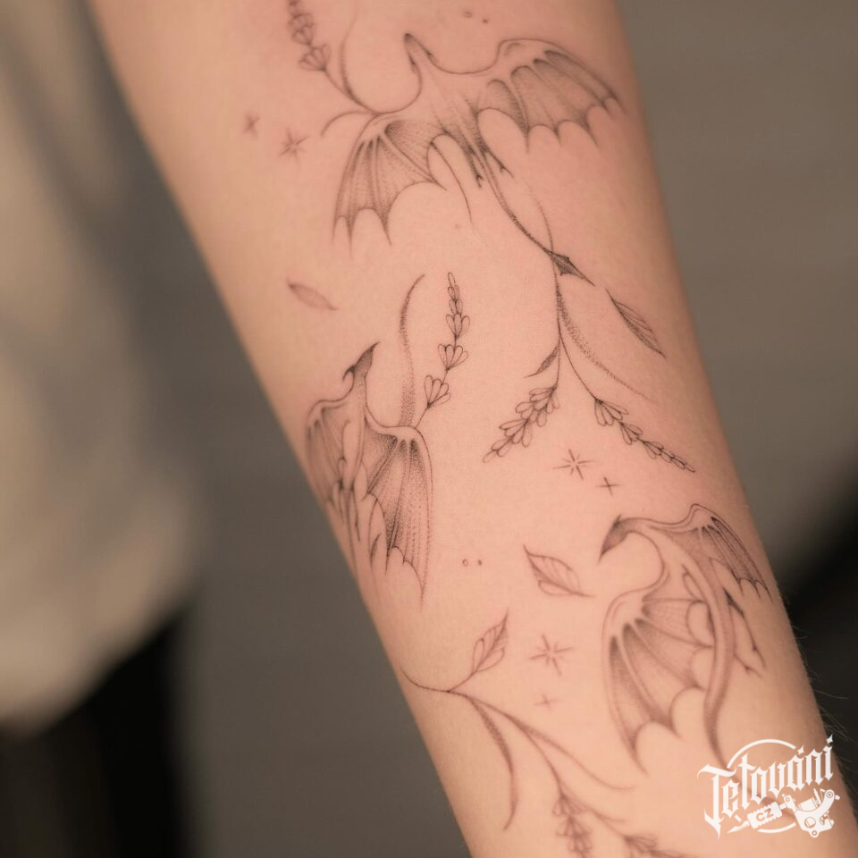 Tetování luční kvítí a draci na ruku