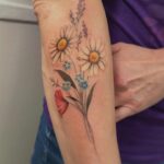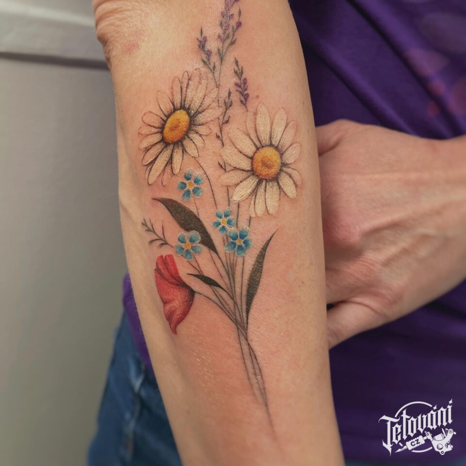 Tetování luční kvítí, kopretina, vlčí mák a pomněnky na předloktí