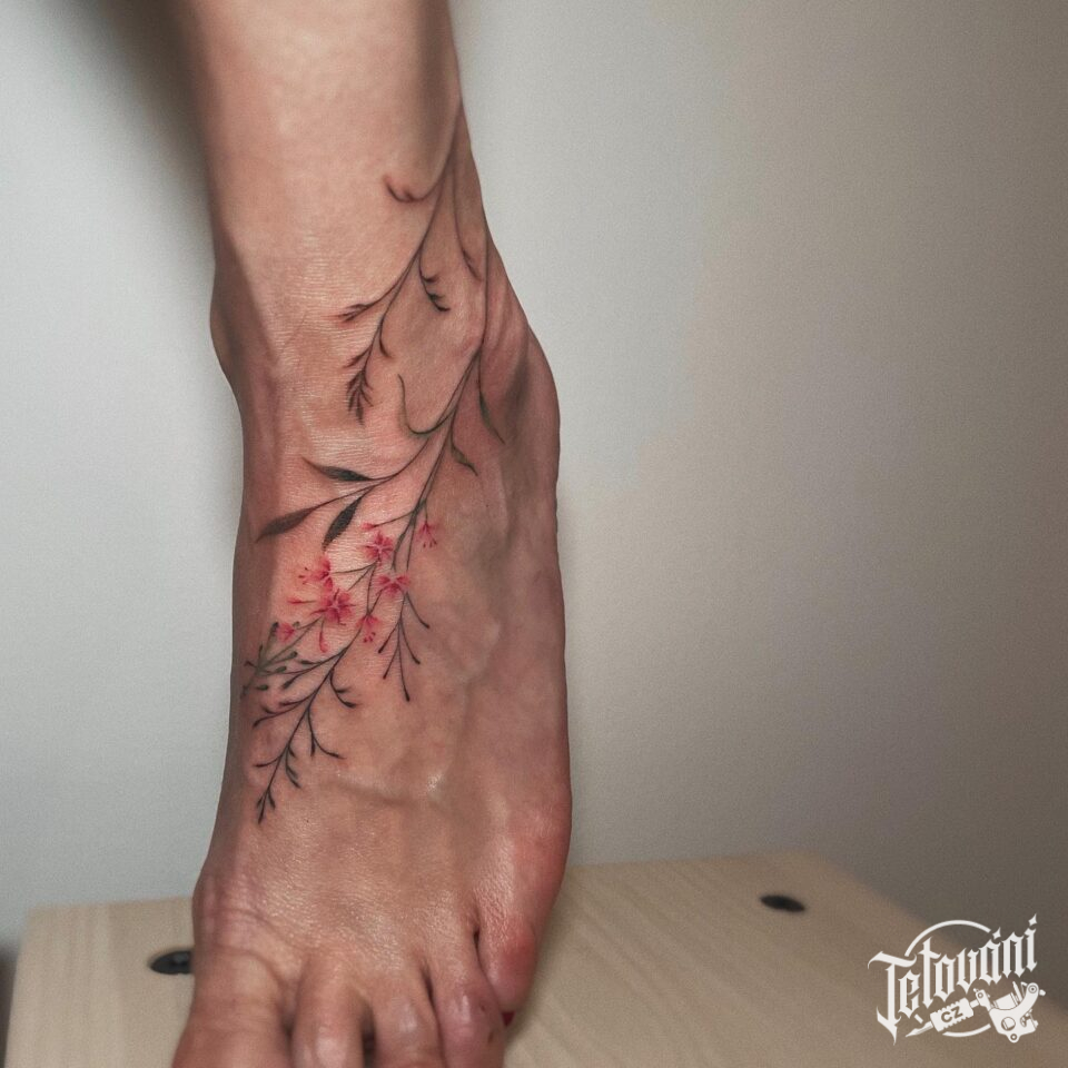 Tetování luční kvítí, květiny na nárt
