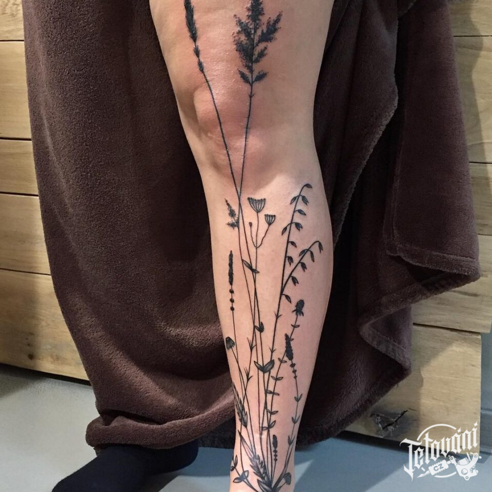 Tetování luční kvítí na holeni