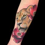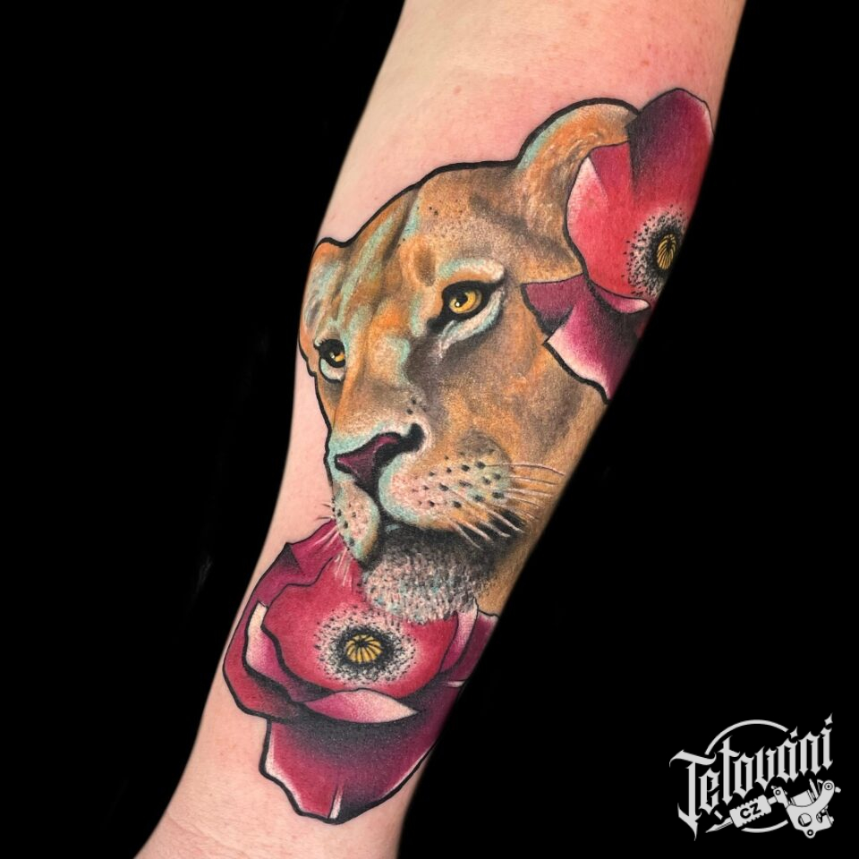 Tetování lvice s květy vlčího máku na předloktí