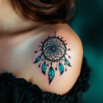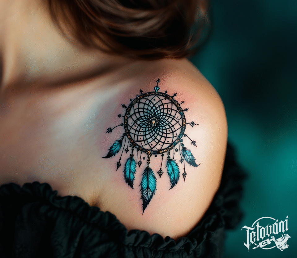 Tetování magické symboly ochrany, lapač snů na rameni