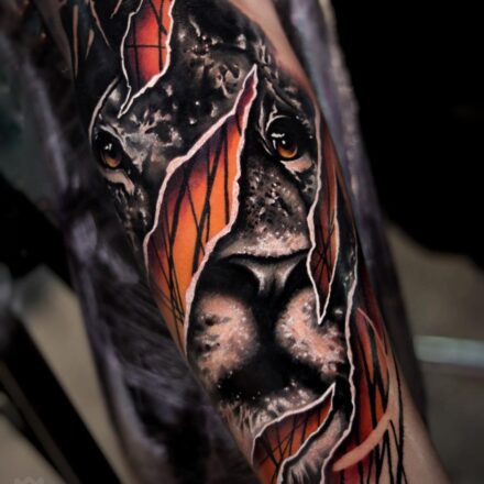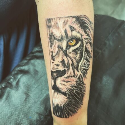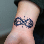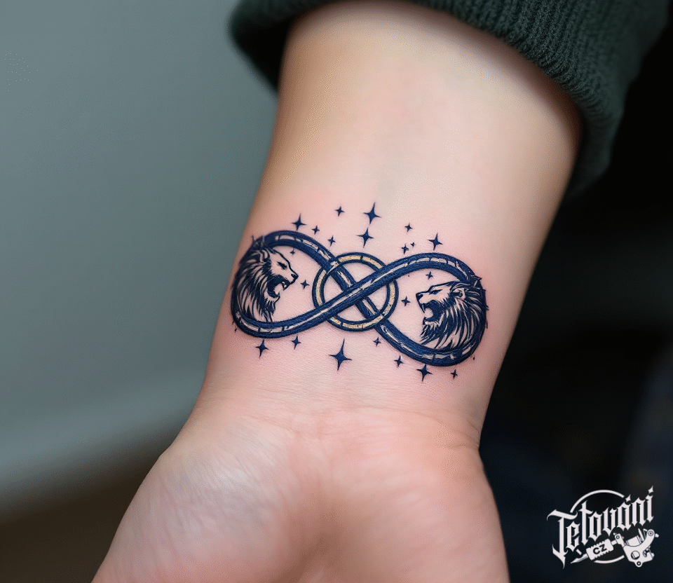 Tetování magické symboly ochrany, ležatá osmička a lvi na zápěstí