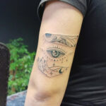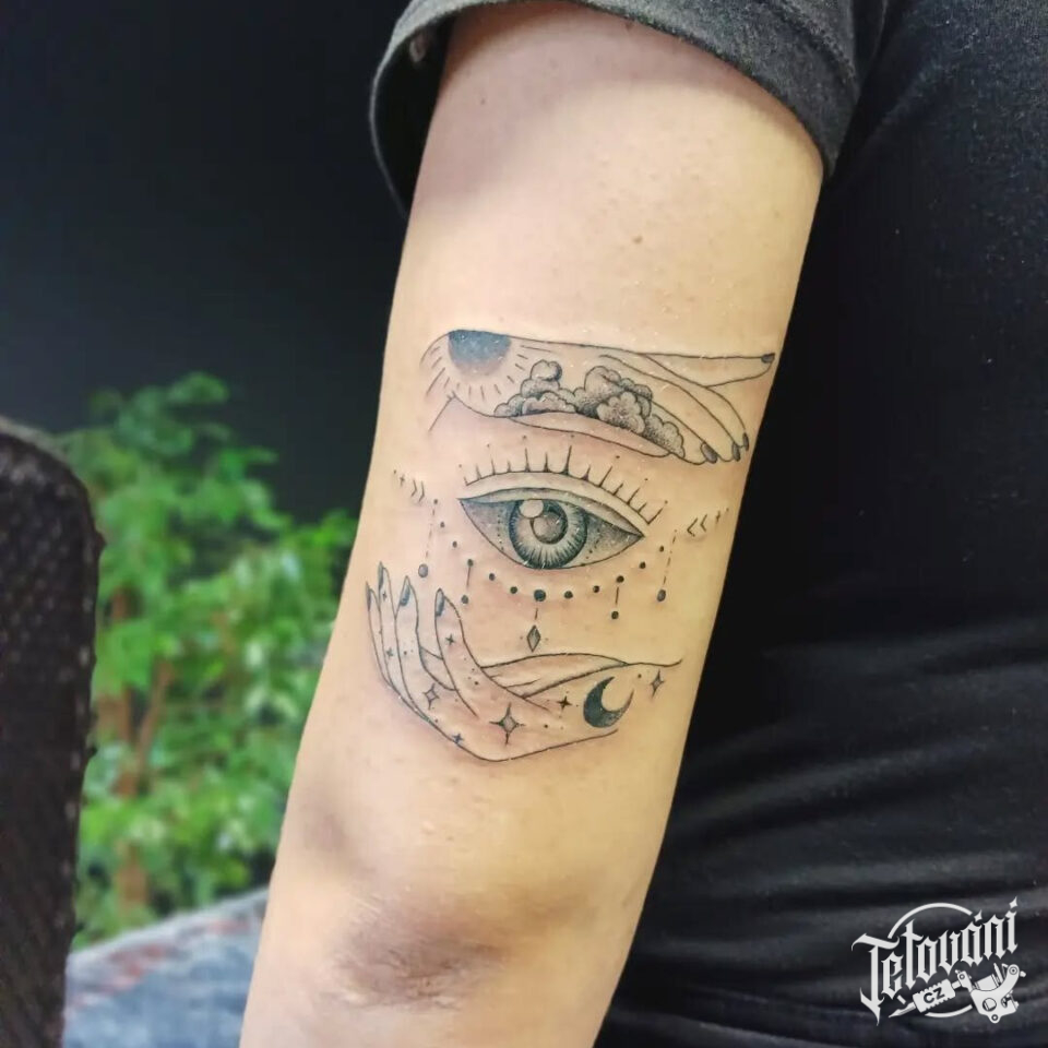 Tetování magické symboly, oko a ruce na paži
