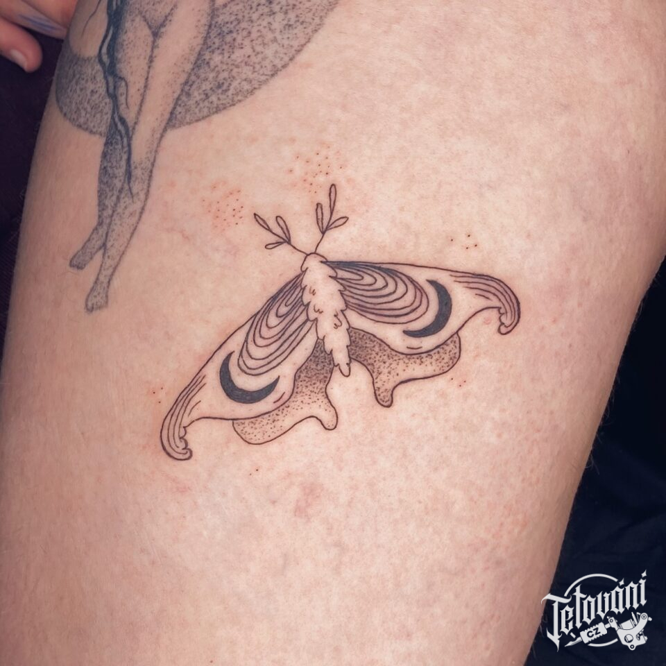 Tetování malá můra na stehno