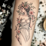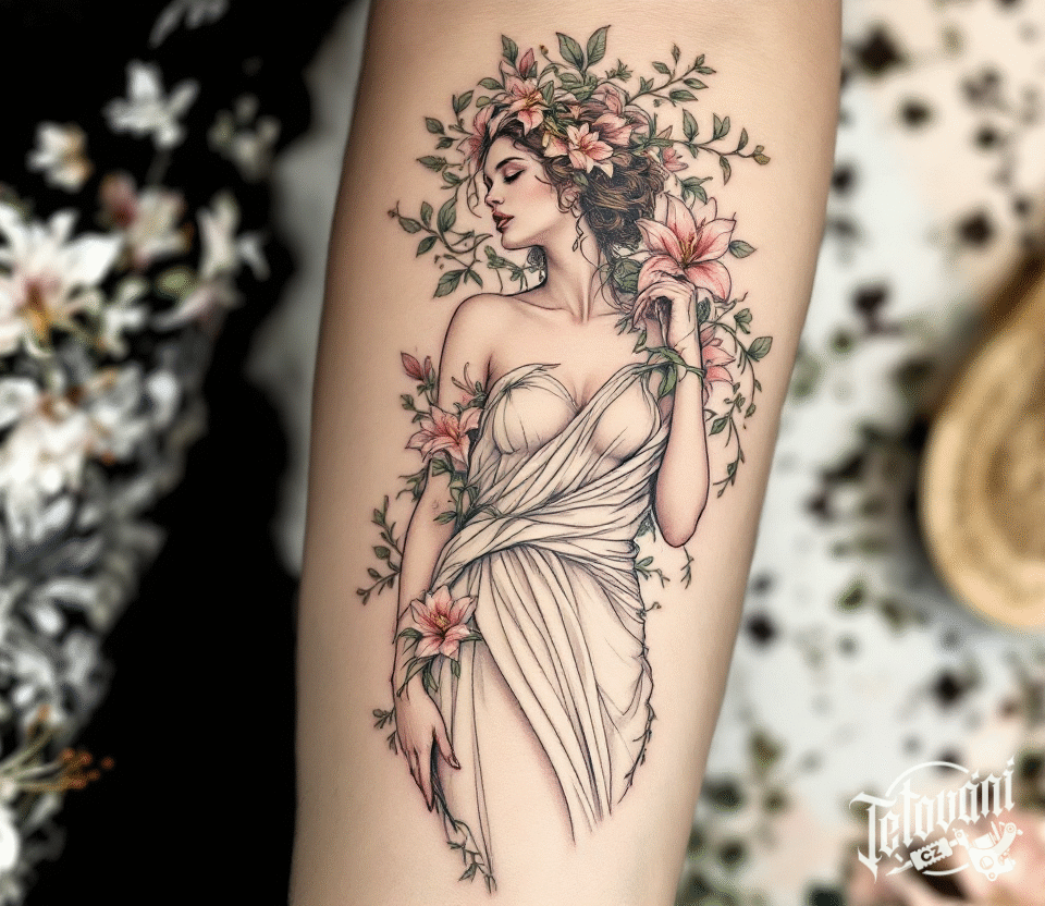 Tetování malba ženy s květinami Alfonse Muchy na předloktí