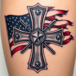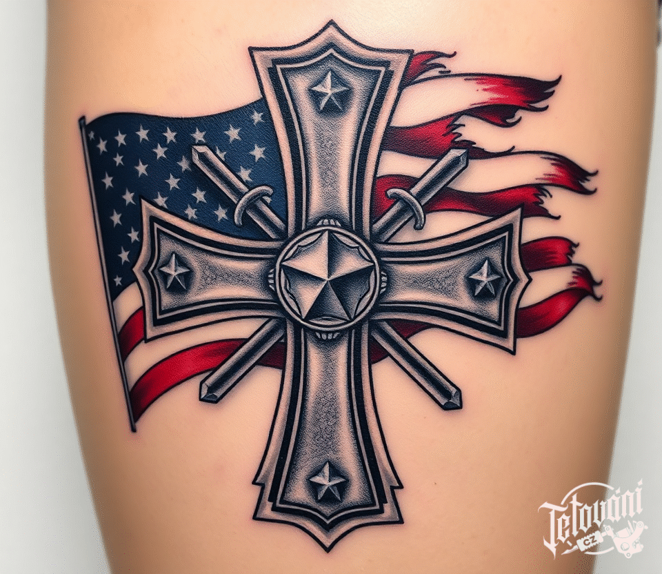 Tetování maltézský kříž s vlajkou USA na bok stehna