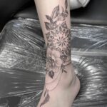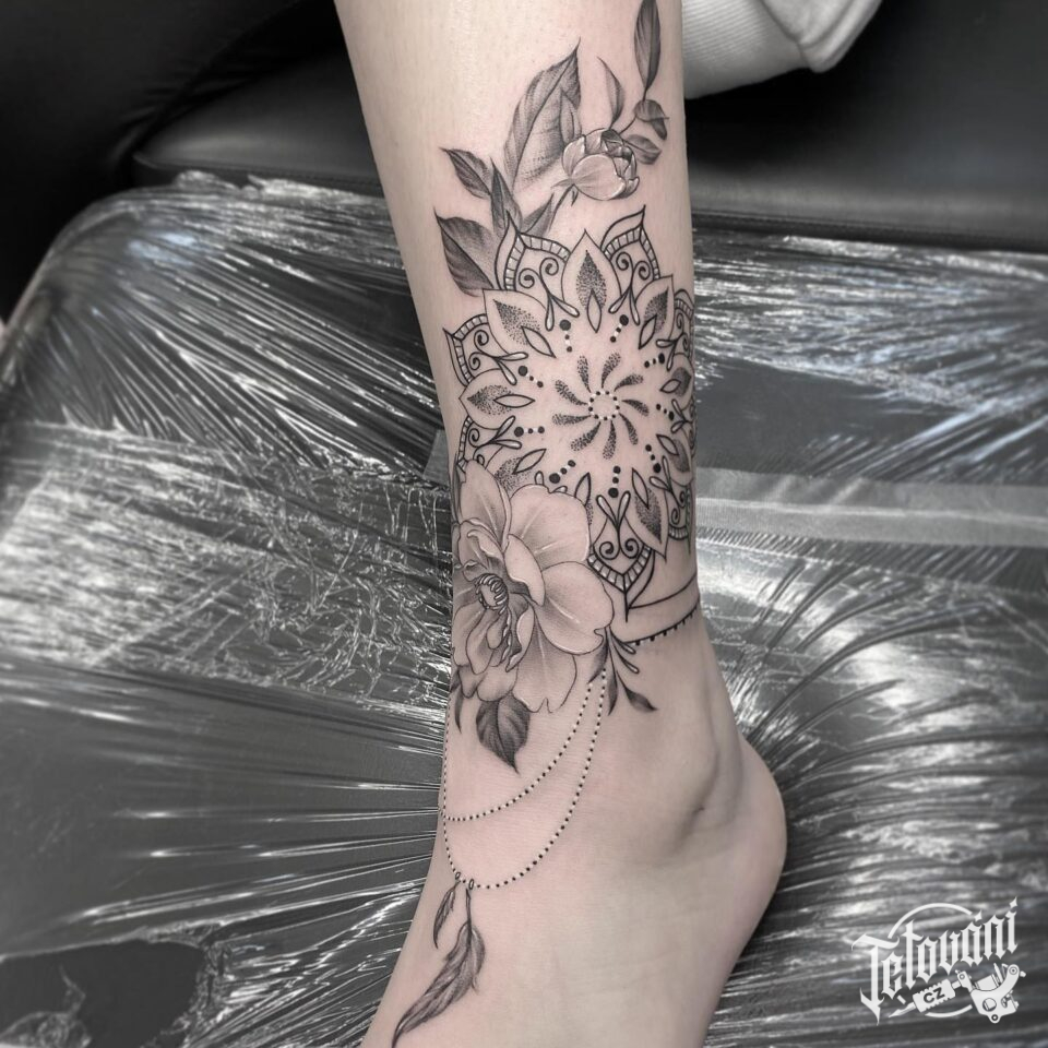 Tetování mandala a květiny na lýtku