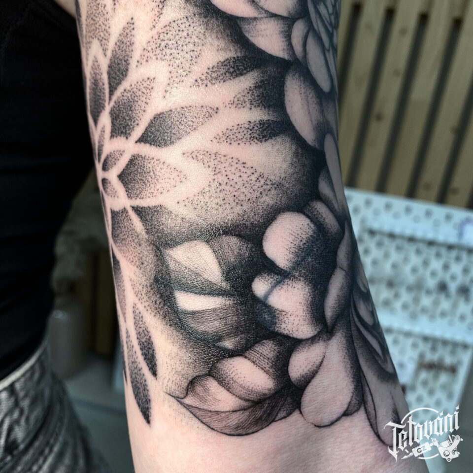 Tetování mandala a květiny na paži