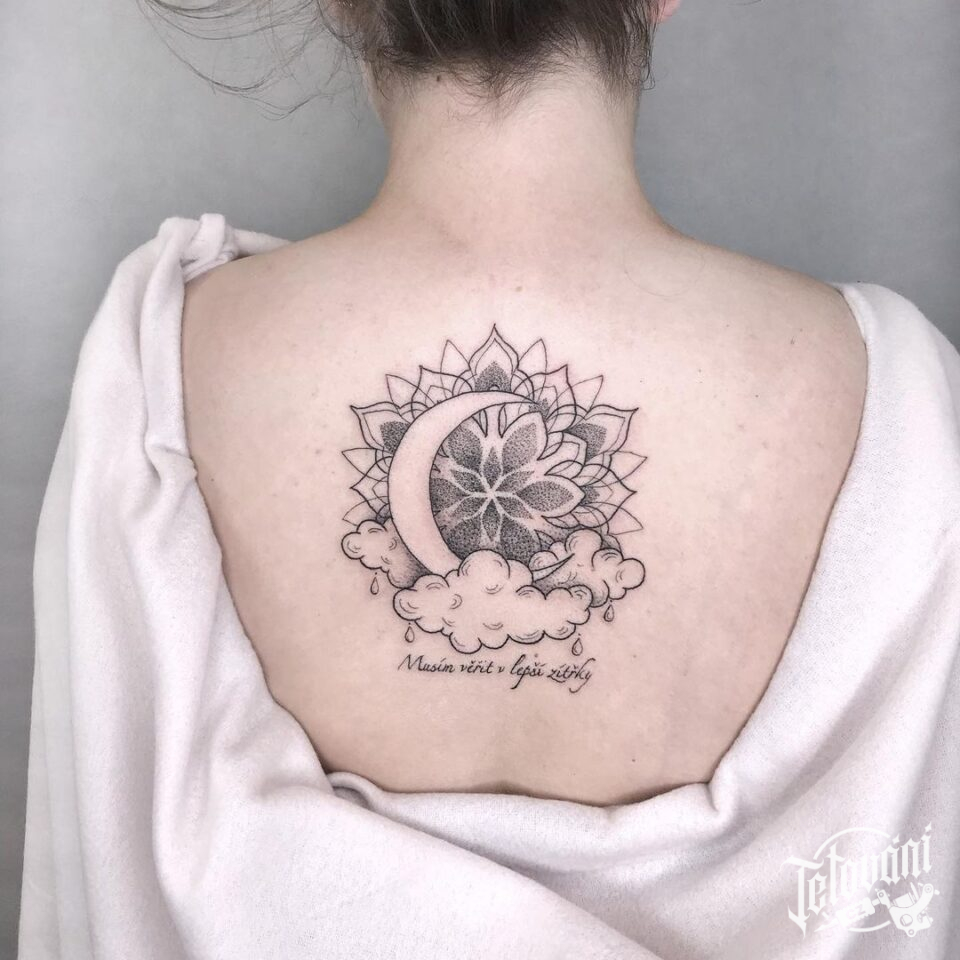 Tetování mandala s měsícem a nápisy na zádech