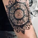 Tetování mandala a znaky a symboly, symbol relikvie smrti z filmu Harry Potter na předloktí