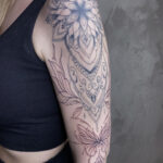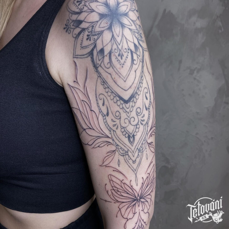 Tetování mandala, mandala štěstí a zvířata, motýl na rukáv