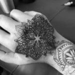 Tetování mandala, mandala štěstí na hřbetu ruky