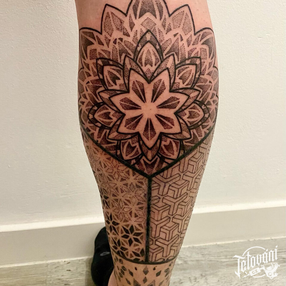Tetování mandala s geometrickými tvary na lýtku