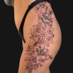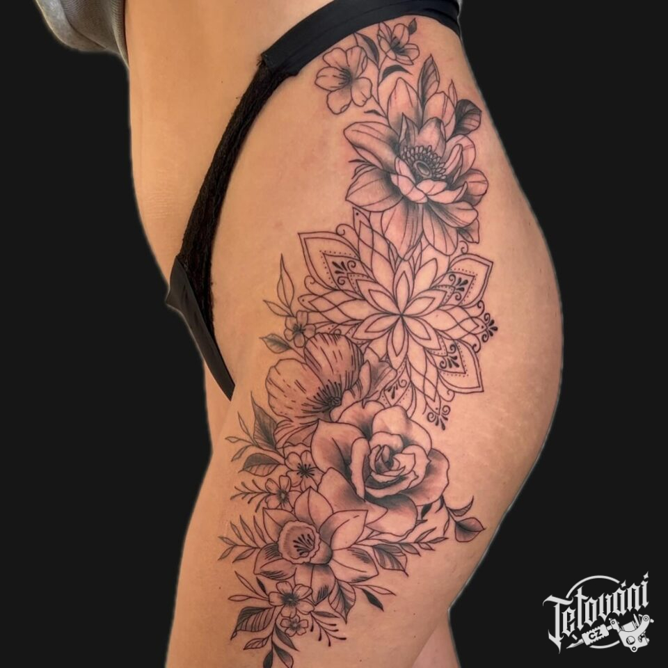 Tetování mandala s květinami na boku stehna