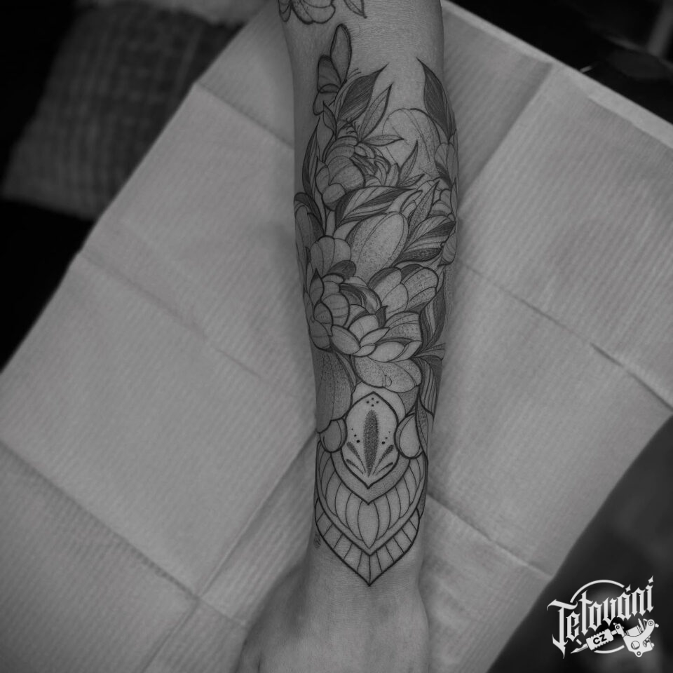 Tetování mandala s květinami na předloktí