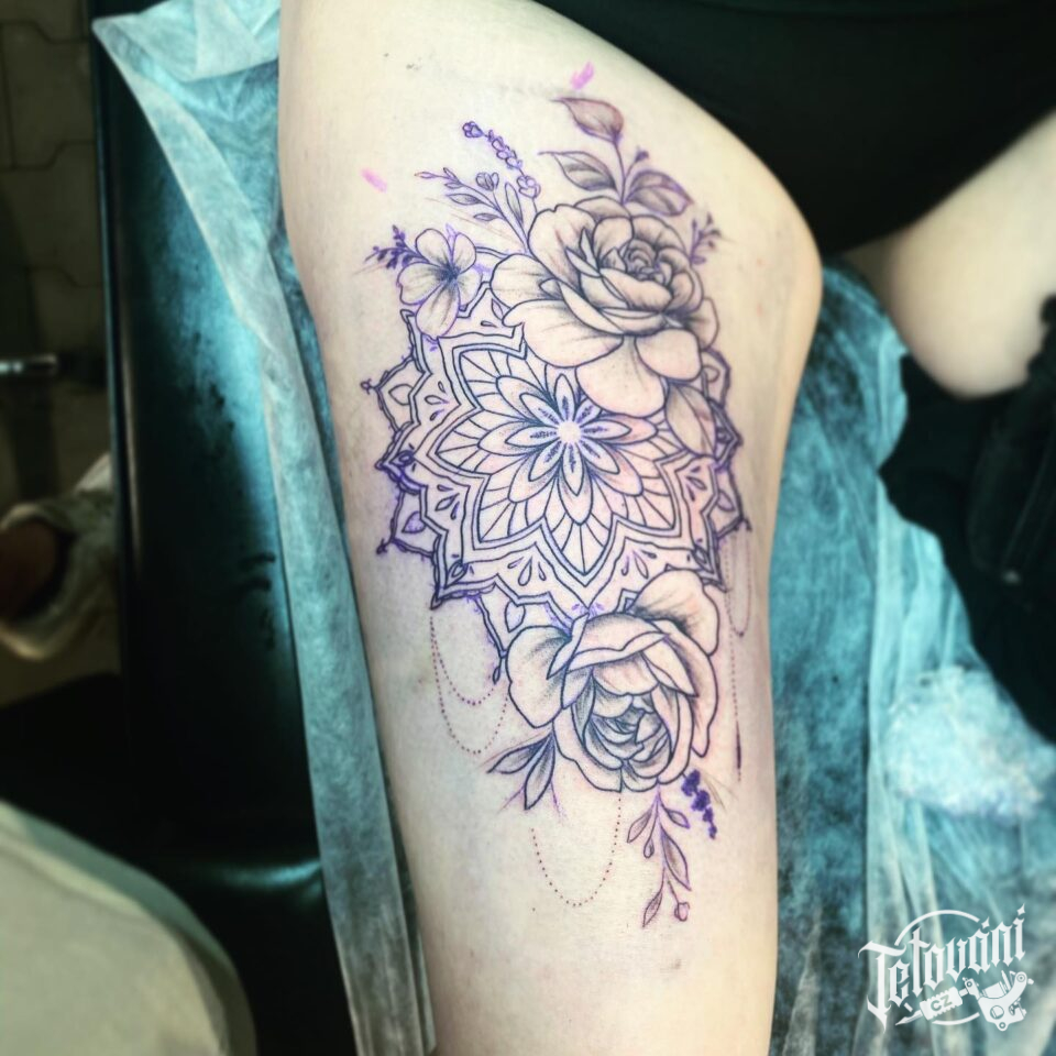 Tetování mandala s květinami na stehně