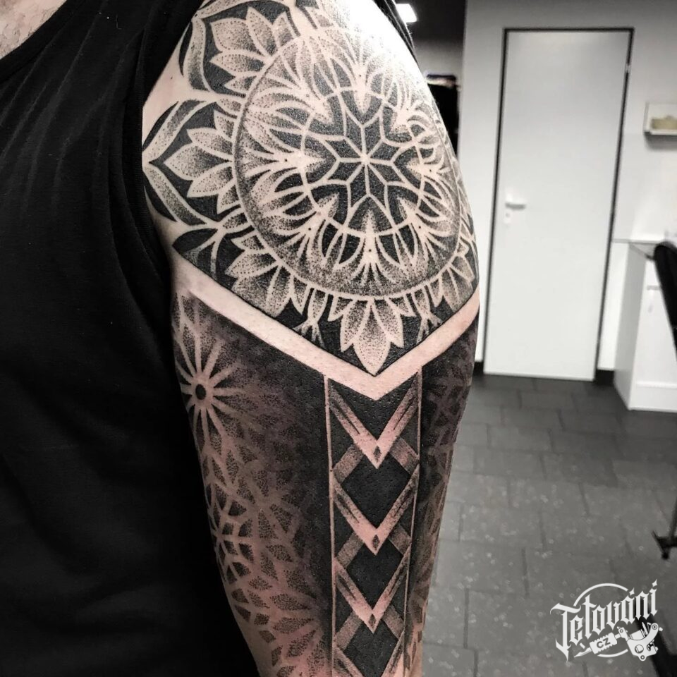Tetování mandala s ornamenty na rameni