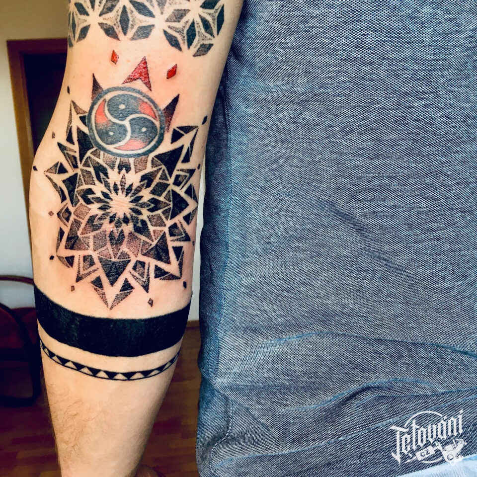 Tetování mandala se znakem na lokti