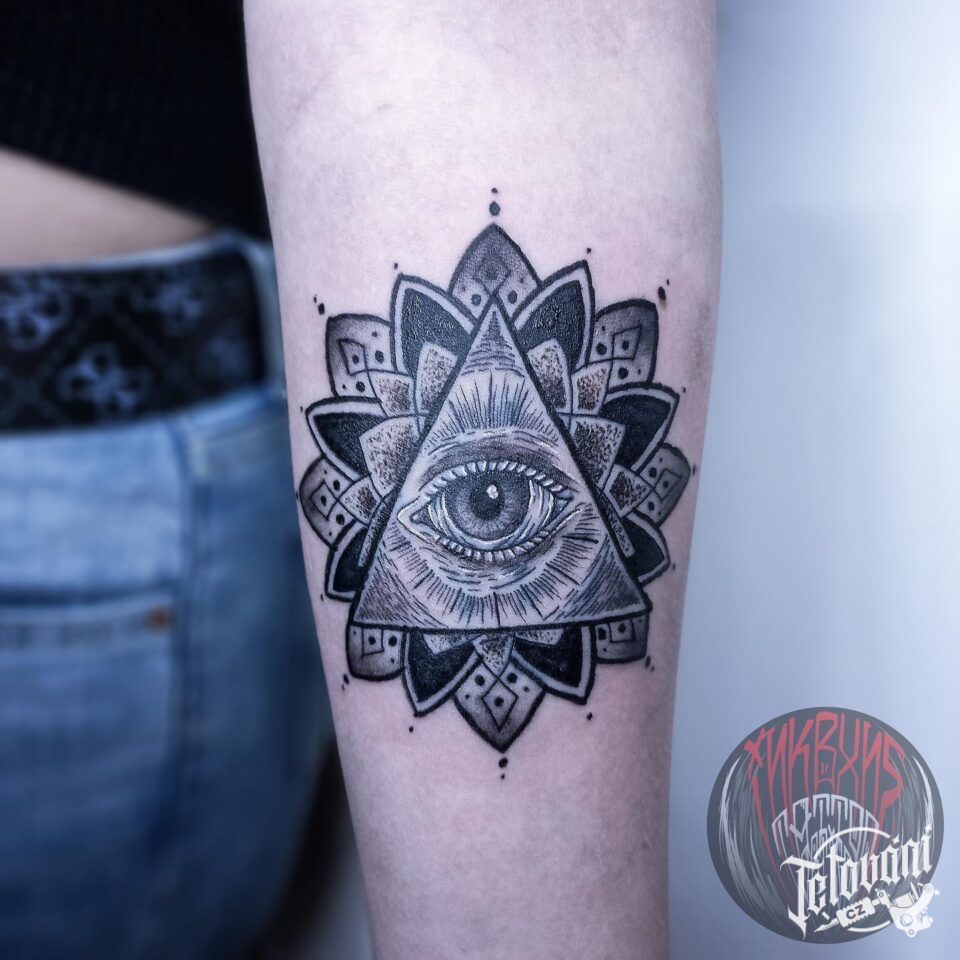 Tetování mandala štěstí a boží oko na předloktí