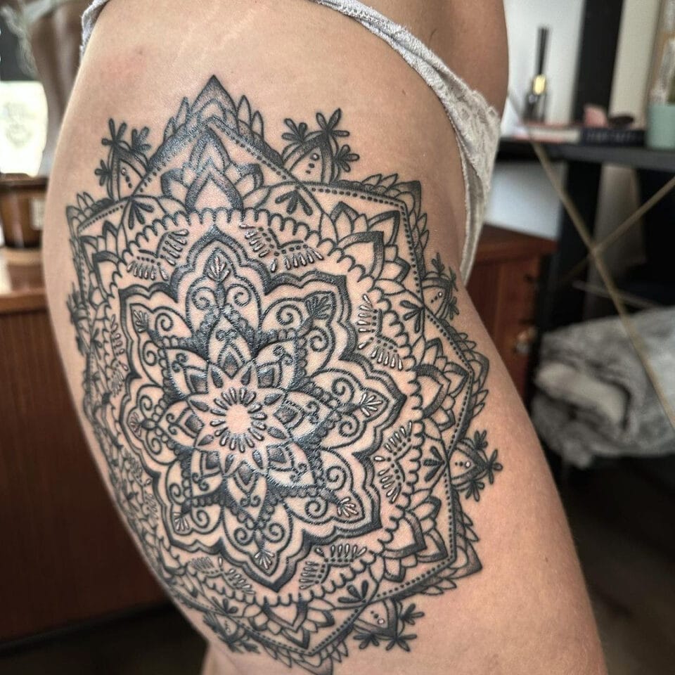 Tetování mandala štěstí na stehno