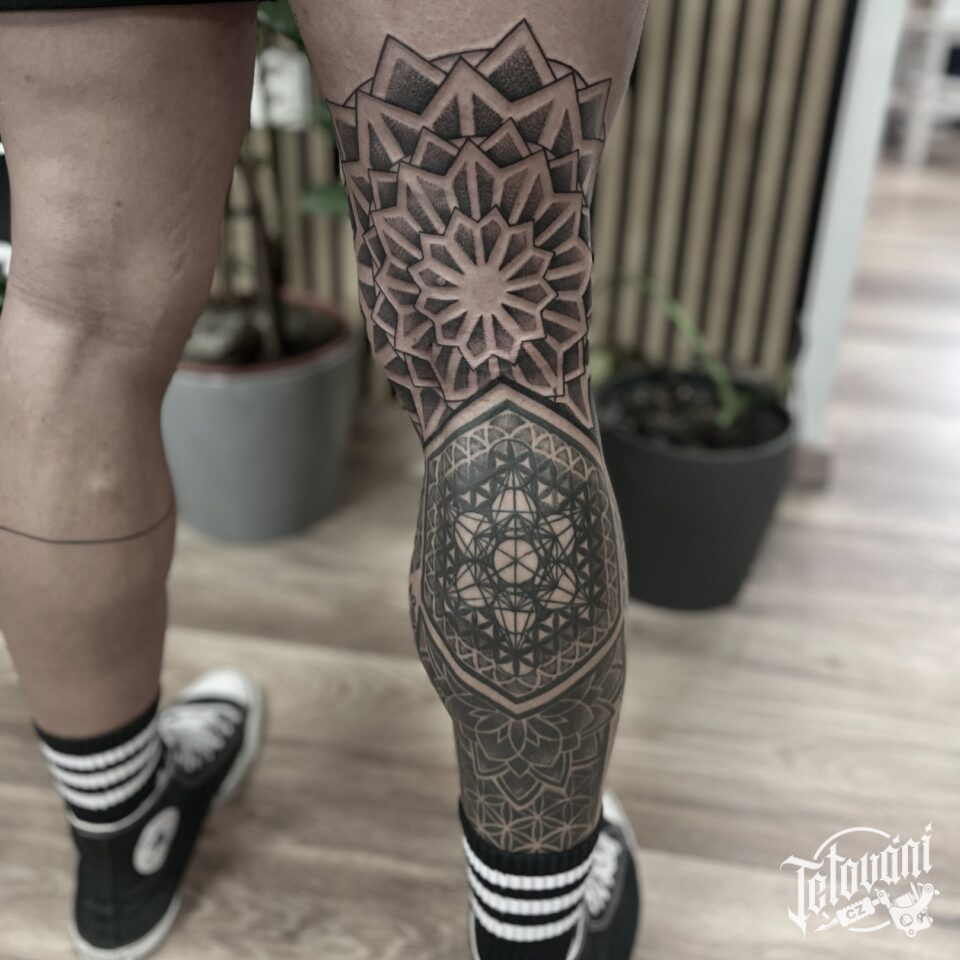 Tetování mandala, znaky a symboly na lýtko a stehno