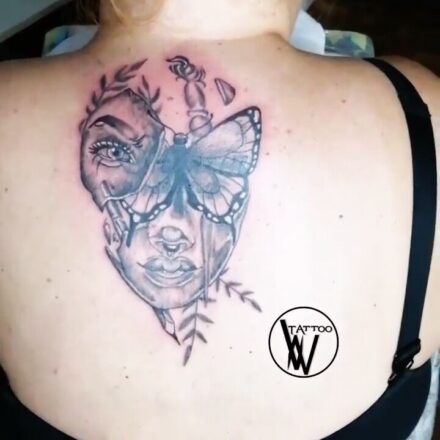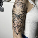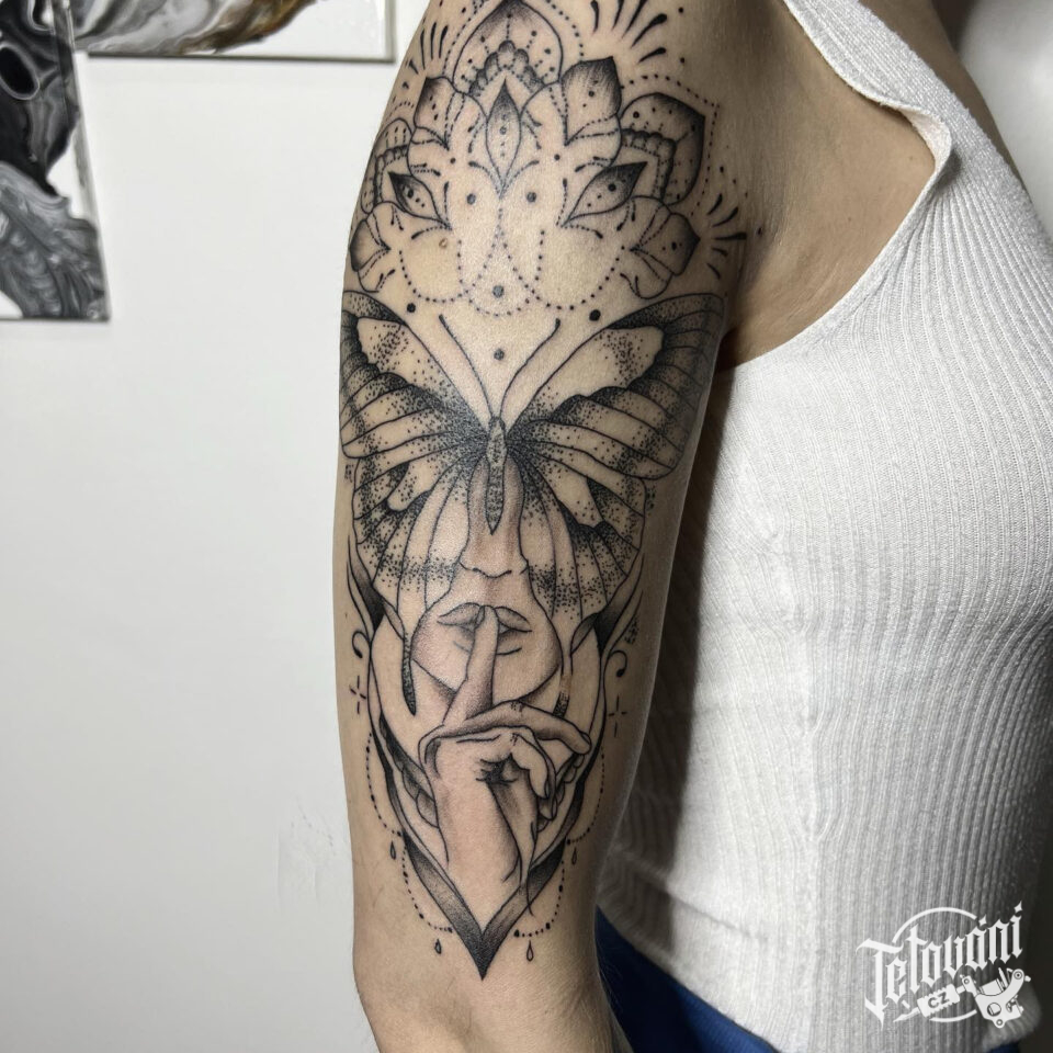 Tetování mandala, zvíře, motýl a portrét ženy na rameni