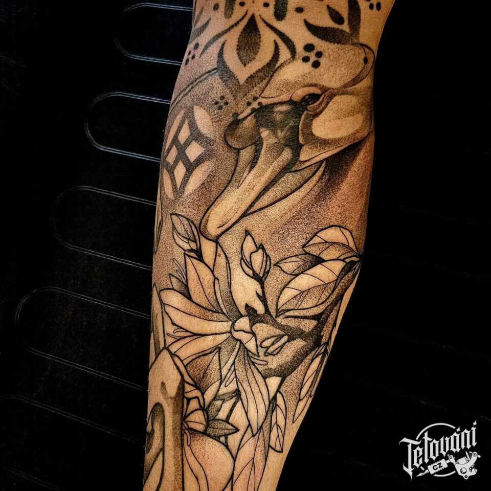 Tetování mandala, zvíře, pták, květiny, rukáv