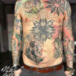 Tetování mandaly, buddha, opice na břichu