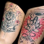 Tetování mandaly, buddha, symboly života na stehna