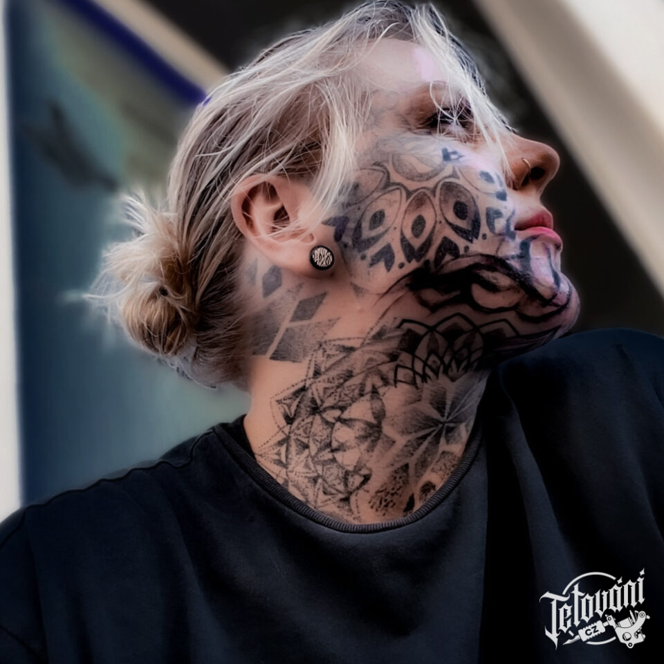Tetování mandaly, mandala lotus a mandala štěstí, symboly na obličej a krk