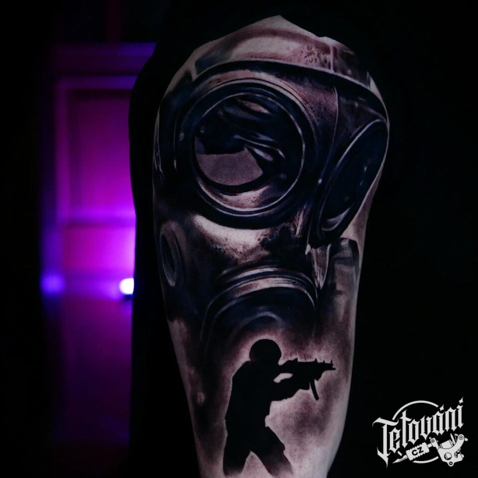 Tetování maska a voják na rameni