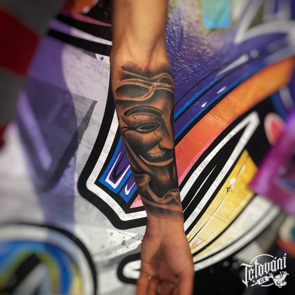 Tetování maska Anonymous na předloktí