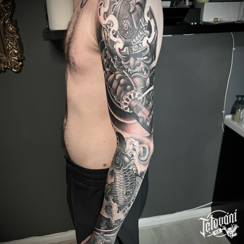 Tetování maska, bojovník a zvíře, ryba na rukáv