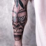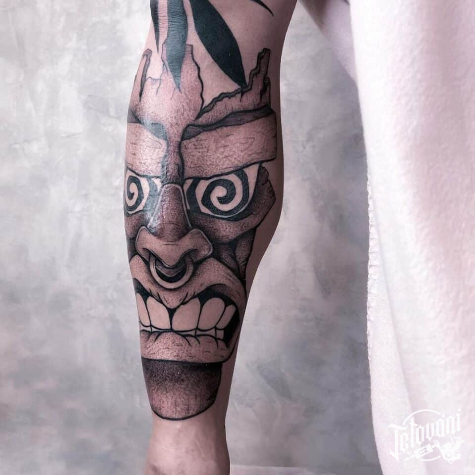 Tetování maska domorodce na holeň