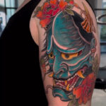 Tetování maska Hannya a květy na rameno