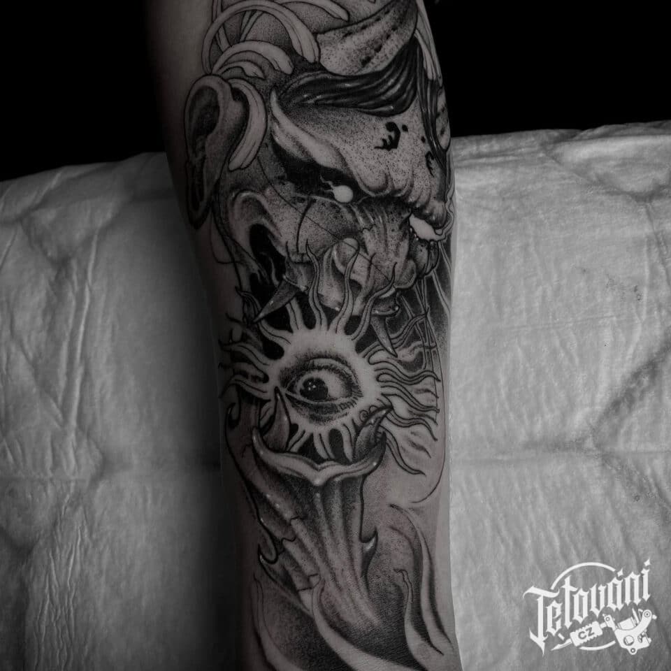 Tetování maska Hannya a oko na předloktí