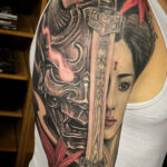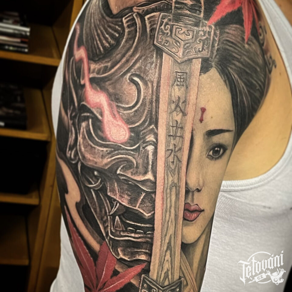 Tetování maska hannya, meč a gejša na rameni
