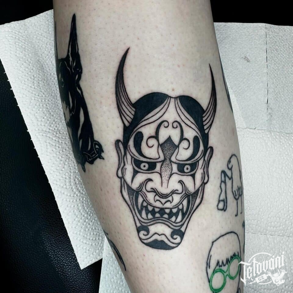 Tetování maska Hannya na holeň
