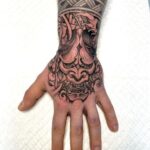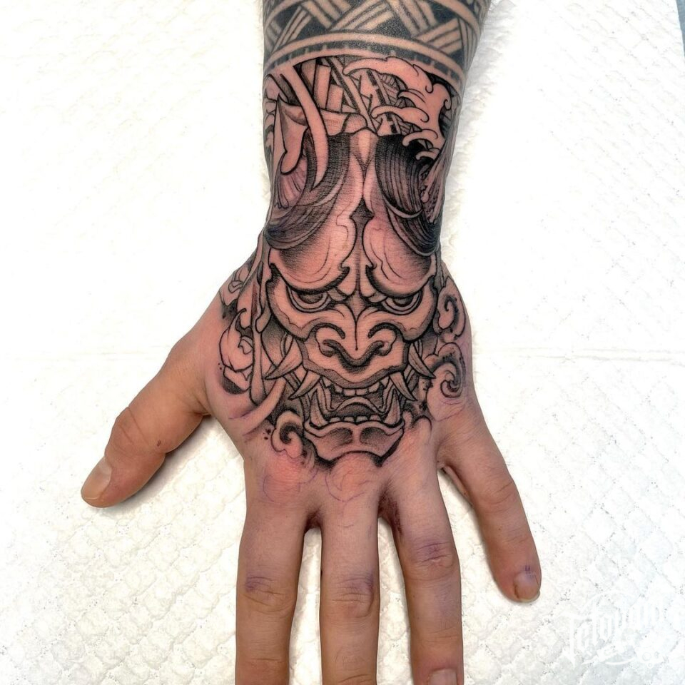 Tetování maska hannya na hřbetu ruky