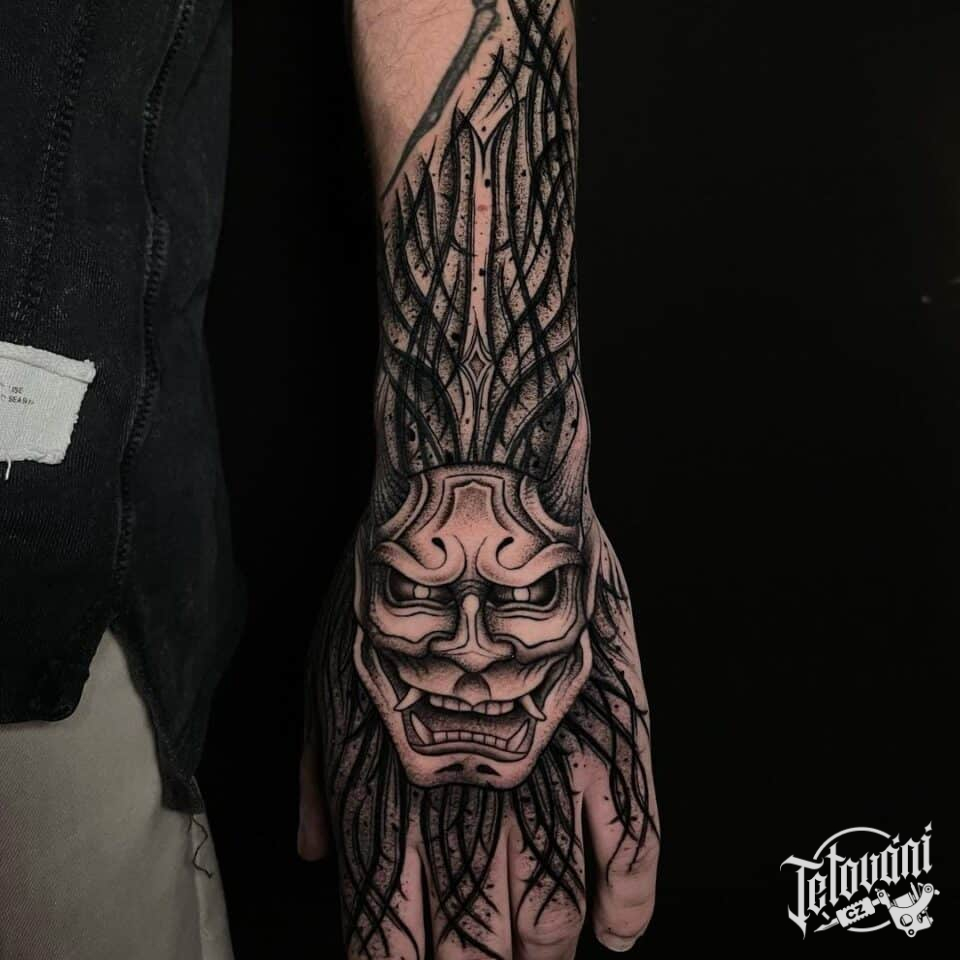 Tetování ďábelská maska Hannya na hřbetu ruky