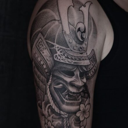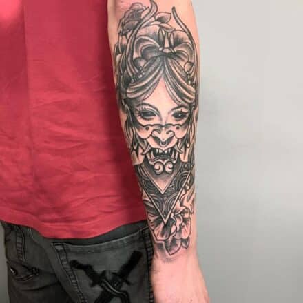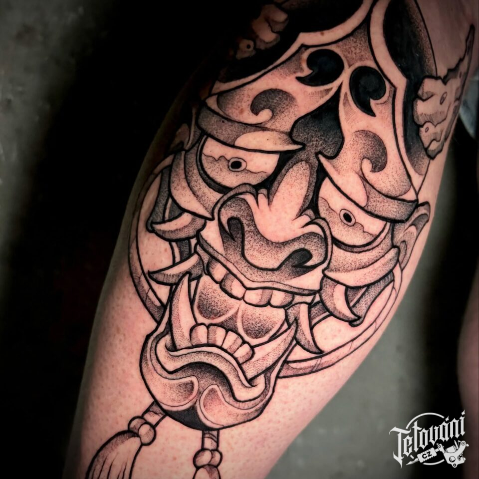 Tetování maska hannya na lýtku